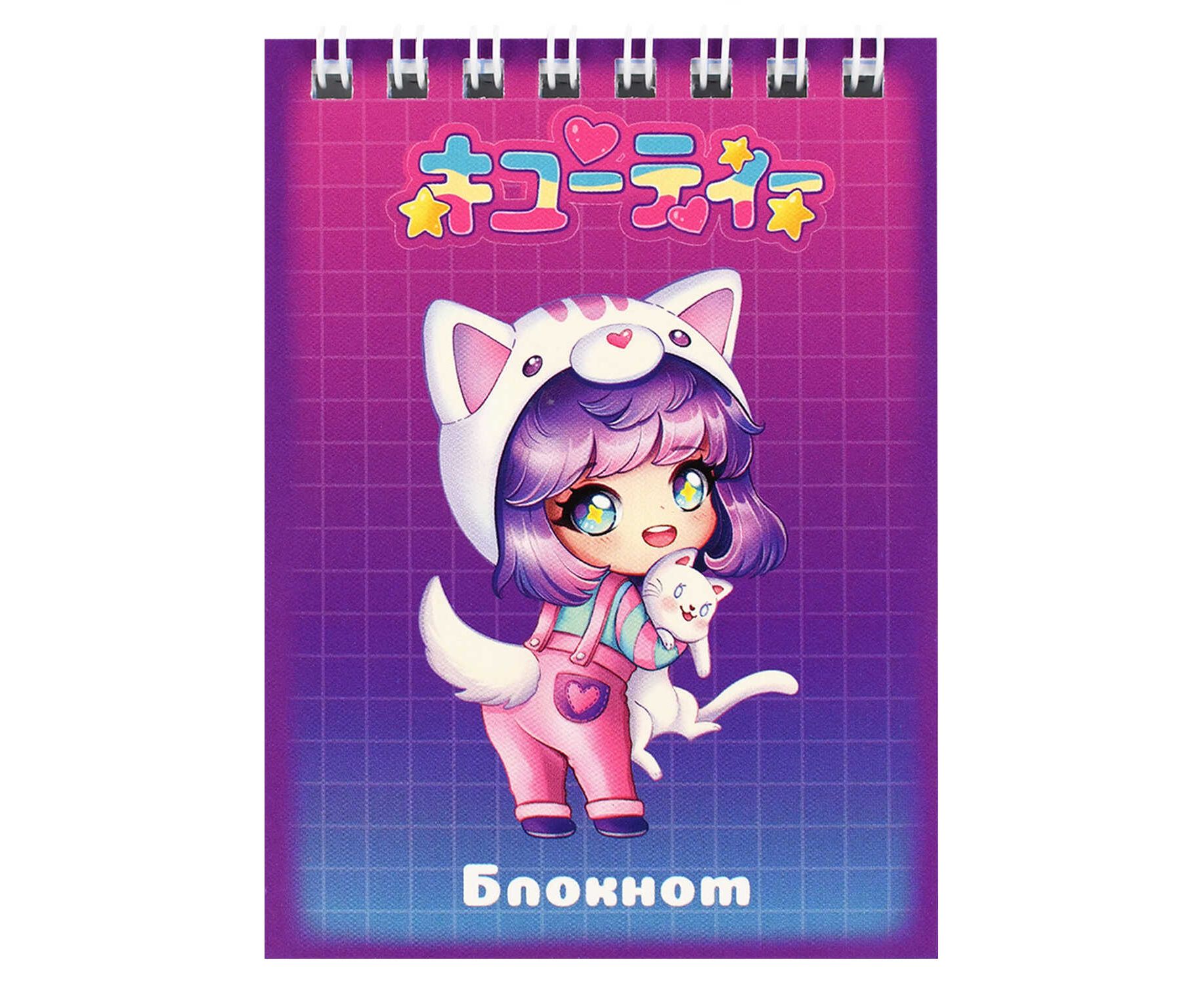 Блокнот, А7, 40 л, арт. 68172 ЧИБИ С КОТОМ / Блок - белый офсет 65 г/м², клетка, гребень по короткой стороне, УФ-лак сплошной,
