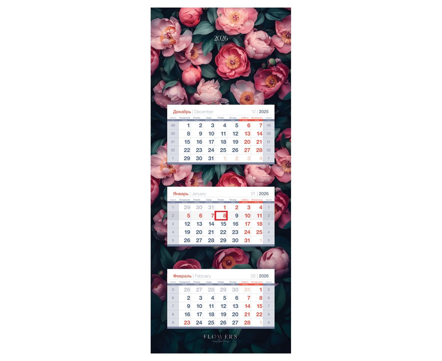 Календарь квартальный bg «Роскошь цветов» серии «Люкс» на 2026 год — отличный инструмент для планирования в офисе и дома. Размер календаря — 340*840 мм. Блоки изготовлены из мелованной белой бумаги плотностью 80 г\м2 с печатью в две краски. Тип скрепления — склейка. Подложка изготовлена из картона с полноцветной печатью. Бегунок-курсор помогает легко ориентироваться по датам, а пикколо позволяет удобно разместить календарь на стене.