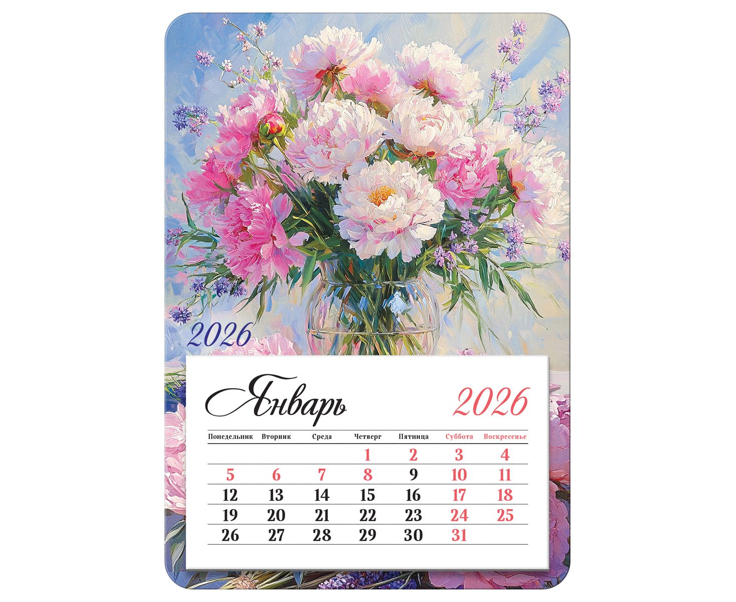 Отрывной календарь на магните «Букет» от бренда bg станет надежным помощником в планировании 2026 года. Календарь имеет компактный размер 95×135 мм. Изделие состоит из 12 листов качественной офсетной бумаги плотностью 80 г/м² с печатью в 2 краски. Сильный магнит надежно удерживает календарь на любой металлической поверхности, например, на холодильнике.