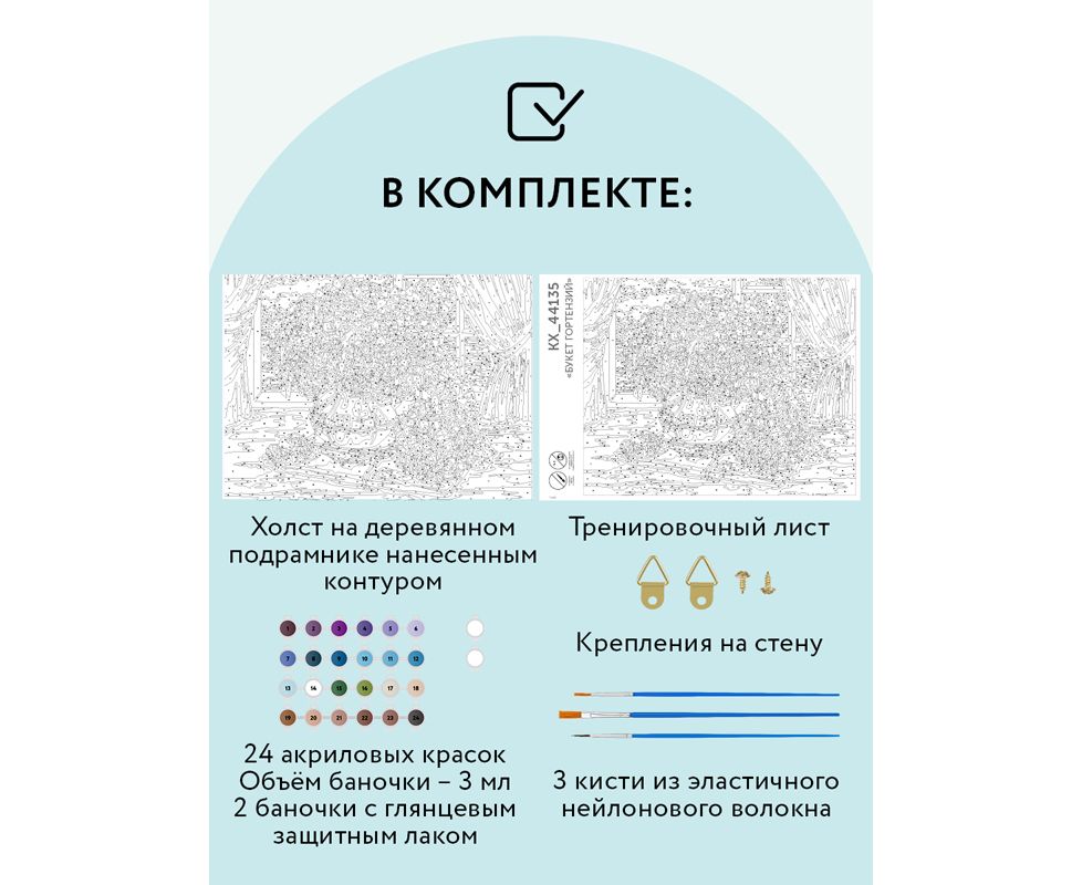 • холст на деревянном подрамнике 30х40 с нанесенным контуром, пронумерованный в соответствии с номерами красок. Контур под раскрашивание нанесен в том числе и на торцы подрамника, что позволяет разместить готовую работу на стене, не обрамляя в багет или раму. Технология точной разбивки сюжета картины на разные цветовые оттенки гарантируют правильность исполнения полотна;