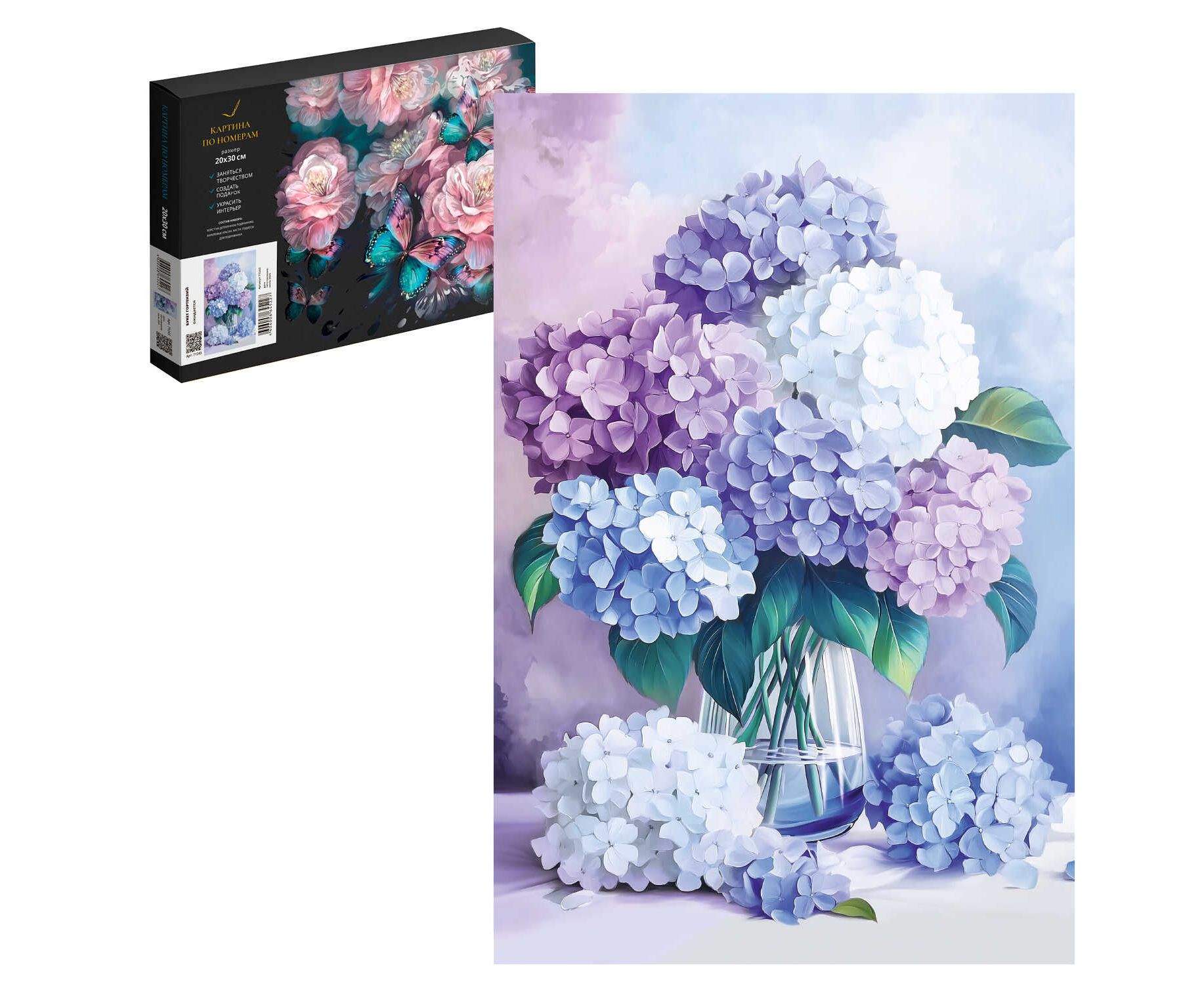 Набор для творчества Картина по номерам БУКЕТ ГОРТЕНЗИЙ, размер: 20х30 см, (15 цвета (-ов), холст на деревянном подрамнике с напечатанной схемой рисунка, контрольный лист с нанесенной схемой, краски акриловые на водной основе (упакованы в вакуумную упаковку), кисти художественные с ворсом из нейлона – 4 шт., подвесы для подрамника, пакет на zip-молнии, лак в комплекте, картонная коробка)