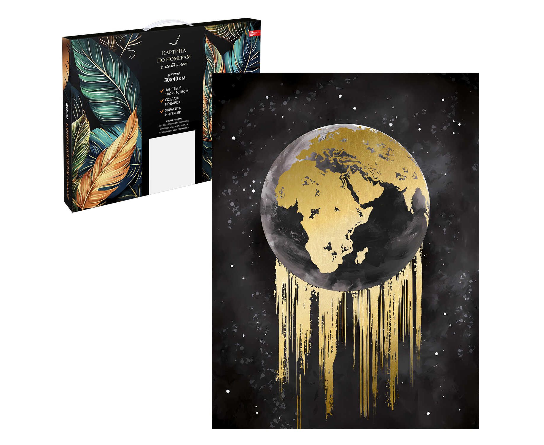 Набор для творчества Картина по номерам с поталью ПЛАНЕТА, размер: 30х40 см, (10 цвета (-ов), холст на деревянном подрамнике с напечатанной схемой рисунка, краски акриловые на водной основе (упакованы в вакуумную упаковку), кисти художественные с ворсом из нейлона – 4 шт., поталь, клей для потали, лак, пакет на zip-молнии, подвесы для подрамника, контрольный лист с нанесенной схемой в комплекте, поталь: золотая, картонная коробка с ручкой)
