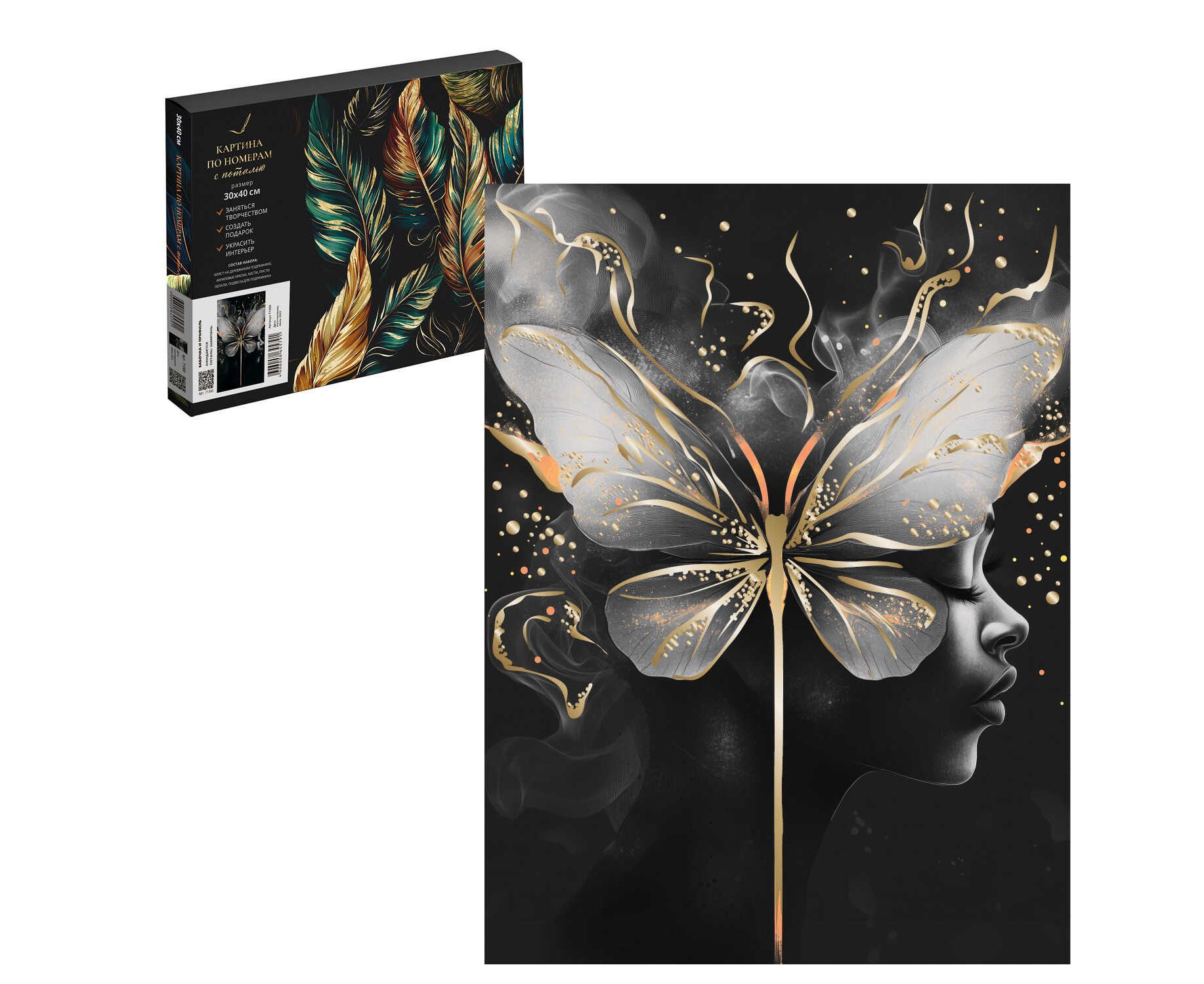 Набор для творчества Картина по номерам с поталью на черном холсте ДЕВУШКА С БАБОЧКОЙ, размер: 30х40 см, (13 цвета (-ов), холст на деревянном подрамнике с напечатанной схемой рисунка, краски акриловые на водной основе (упакованы в вакуумную упаковку), кисти художественные с ворсом из нейлона – 4 шт., поталь, клей для потали, лак, пакет на zip-молнии, подвесы для подрамника, контрольный лист с нанесенной схемой в комплекте, черный холст, поталь: шампань, картонная коробка с ручкой)
