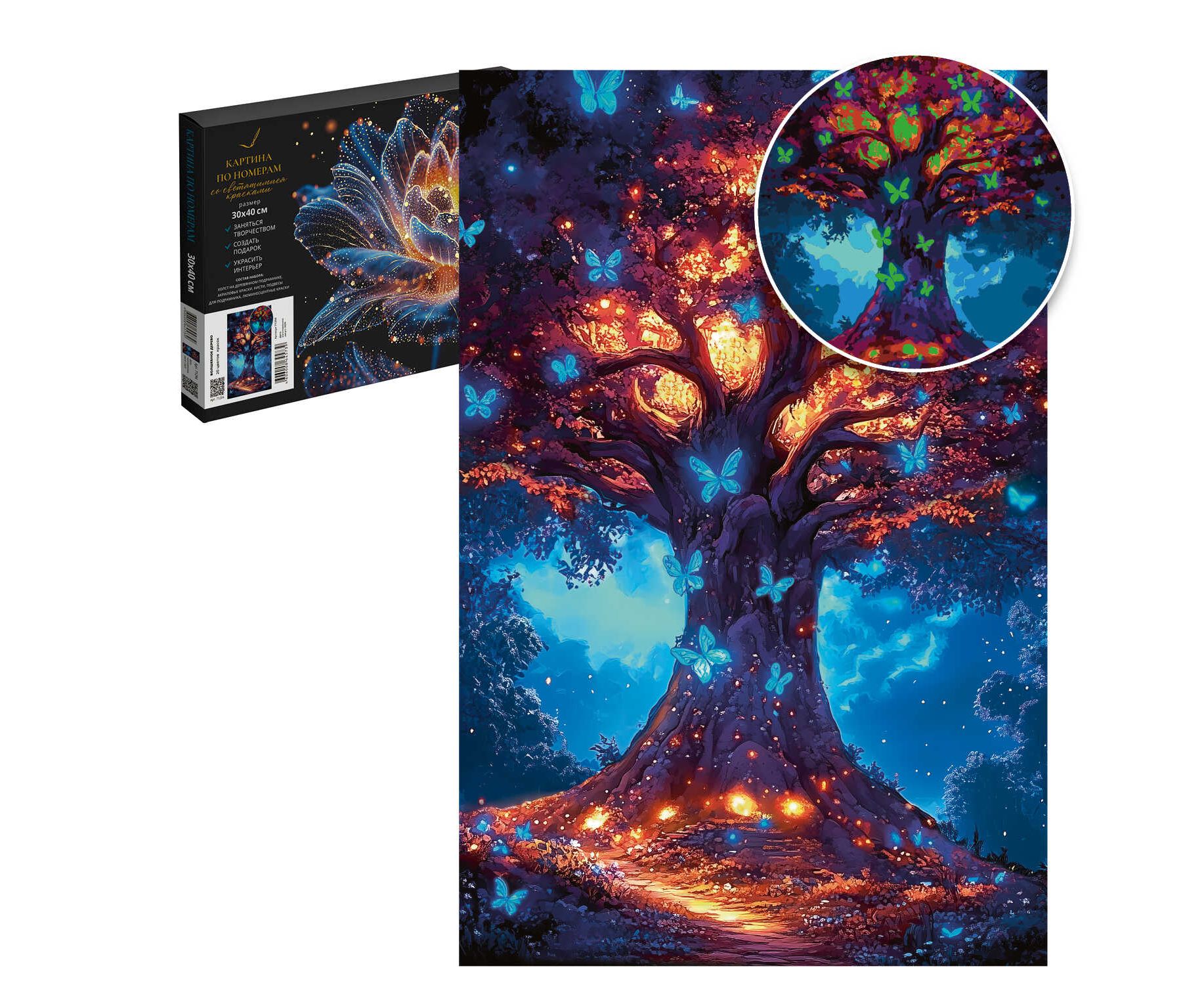 Набор для творчества Картина по номерам со светящимися красками ВОЛШЕБНОЕ ДЕРЕВО, размер: 30х40 см, (20 цвета (-ов), холст на деревянном подрамнике с напечатанной схемой рисунка, краски акриловые на водной основе (упакованы в вакуумную упаковку), люминесцентные (светящиеся в темноте) краски, кисти художественные с ворсом из нейлона – 4 шт., лак, пакет на zip-молнии, подвесы для подрамника, контрольный лист с нанесенной схемой в комплекте, картонная коробка с ручкой)