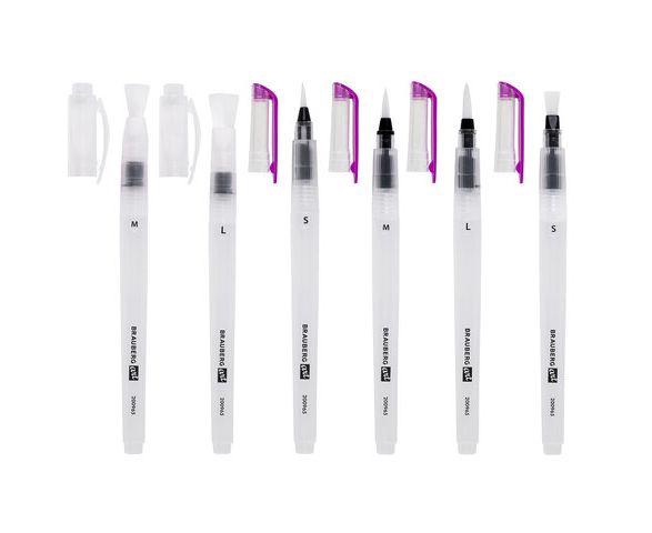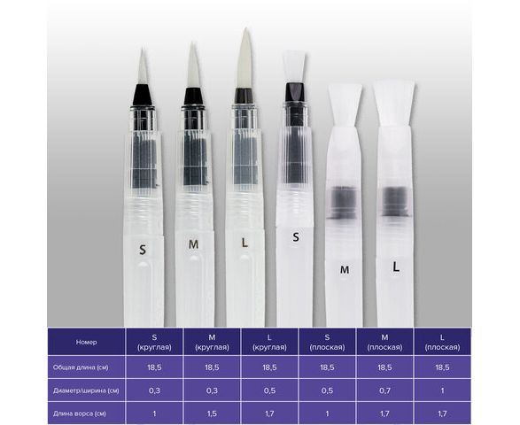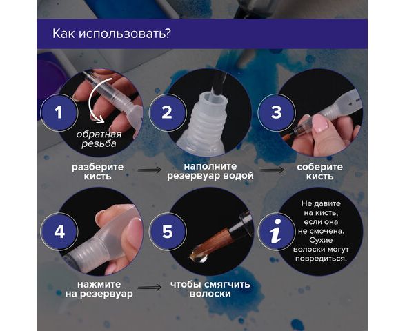 Кисть с резервуаром для воды или аквакисть изготовлена с применением синтетического ворса (нейлона). Мягкий полупрозрачный пластиковый корпус. Есть емкость резервуара для воды. Перо кисти изготовлено из нейлона (S, M, L). Долговечная и упругая, отлично держит форму. При нажатии на мягкий корпус вода поступает к кисти. Форма пучка - круглая, плоская. Упаковка - ПВХ с европодвесом.