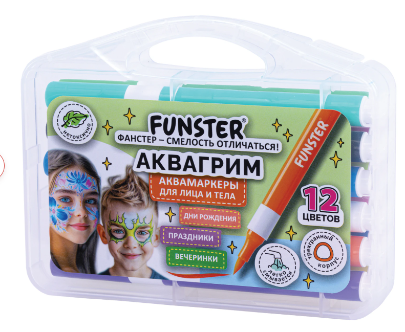 Аквагрим аквамаркеры для лица и тела 12 цветов, FUNSTER (ФАНСТЕР), пластиковый кейс, 152609