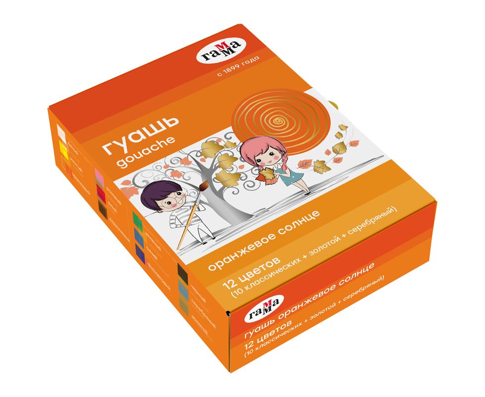 Гуашь Гамма "Оранжевое солнце", 12 цветов (10 классич.+золотой+серебряный), 20мл, картон. упаковка