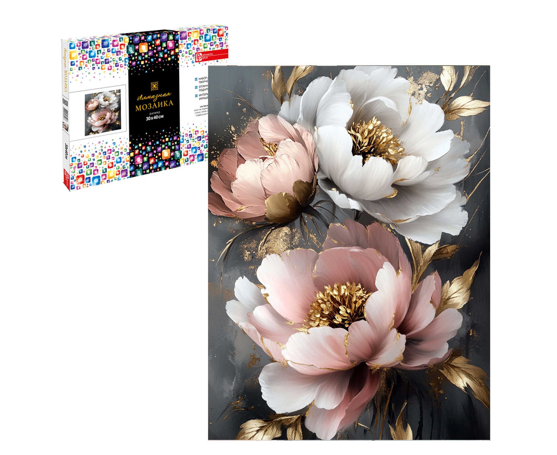 Алмазная мозаика (набор для творчества) ПИОНЫ С ЗОЛОТОМ, размер: 30x40 см, (25 цветов страз, холст на подрамнике с напечатанной картиной, покрытый клеевым слоем и защитной пленкой, пакеты со стразами, стилус, лоток для страз, силикон для страз, клей, подвесы для подрамника, пинцет металлический, схема, дополнительные пакеты с zip-молнией, стикеры для нумерации zip-пакетов в комплекте, форма страз: квадратная, тип выкладки: полная, картонная коробка)