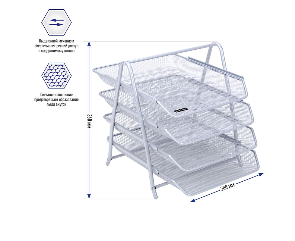 Стильный и практичный горизонтальный лоток с 4 секциями из высококачественного материала. Предназначен для удобного хранения бумажной продукции формата А4. Позволяет легко и эффективно организовать рабочее место. Лотки могут использоваться отдельно от опоры. Выдвижной механизм обеспечивает легкий доступ к содержимому лотков. Легкая и быстрая сборка. Серебристый цвет. Прочный корпус из высококачественного металла. Сетчатое исполнение предотвращает образование пыли внутри. Упаковка в картонную лакированную коробку.